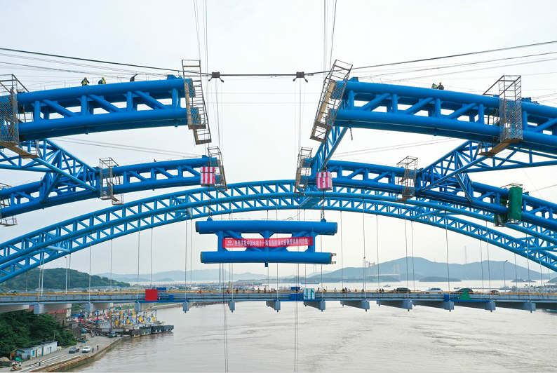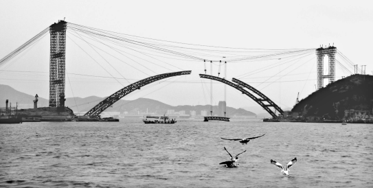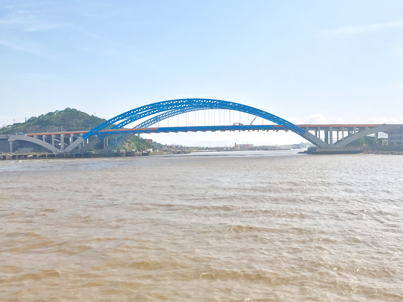 新江南大桥位于大蒲门村与江南岛之间,横跨蒲门水道,系526国道岱山段改建工程主要控制性工程。大桥总长854.40米。主桥系45.5+208+45.5米飞燕中承式钢管混凝土系杆共桥方案,拱轴线采用悬链线,中跨拱桥跨径205米,矢高38.68米,矢跨比为1/5.3,拱轴系数1米=1.25;边拱肋为悬链线箱拱,理论跨径为40.20米,矢高为13.10米,拱轴系数为1.5。拱桥桥面系为8米钢筋砼π型梁,采用先简支后固结体系。51.80米为跨越海事码头库房区域,采用简支钢混组合梁。引桥采用预应力混凝土T梁,下部桥台采用柱式台、U台接桩基础,桥墩采用柱式或培式墩,桥台及桥墩采用柱基础。大桥按二级公路标准由浙江省交通规划设计研究院、宁波公路市政设计有限公司设计单位设计,设计时,根据项目所处的建设条件和功能要求,需适当考虑桥梁景观的整体性,新桥桥型原则上应尽量与现有桥梁景观视野上匹配,新老桥桥墩布设位置应尽量对齐。工程由中电建路桥集团(岱山)建设发展有限公司建设施工,宁波交建工程咨询监理有限公司负责监理。