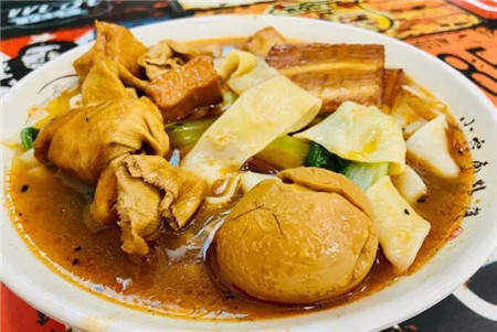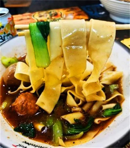 一进门就能闻到特别的香气,隐隐含有草药的味道。板面,用的是宽面,板面劲道耐嚼,汤底味重浓郁。