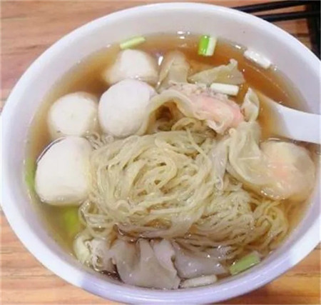 久记全虾云吞面,云吞馅中包裹着一颗虾仁,碱水面条,鱼骨汤打底,很鲜。还有一款全虾蟹籽云吞面。