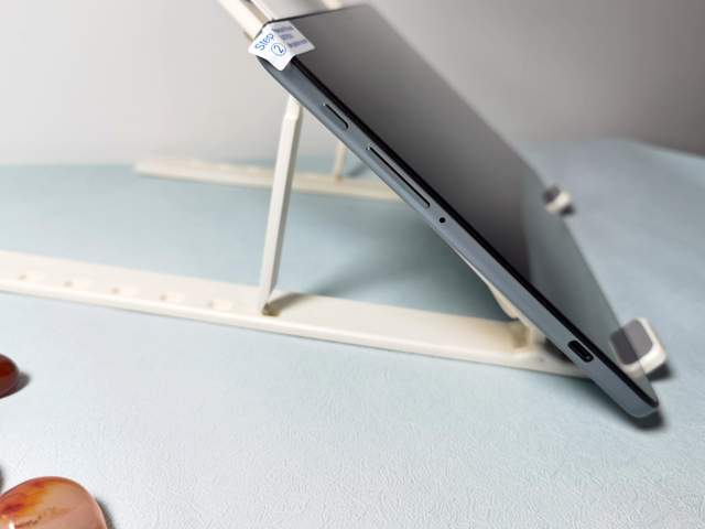 台电T40 pro平板的整机9.2mm 的厚度、480g的重量。与此前入手的一款iPad mini版来说,单手拿着平板看视频也十分轻松。在平放平板时,主机左侧是电源开关、音量键和Type-C接口以及收音口。