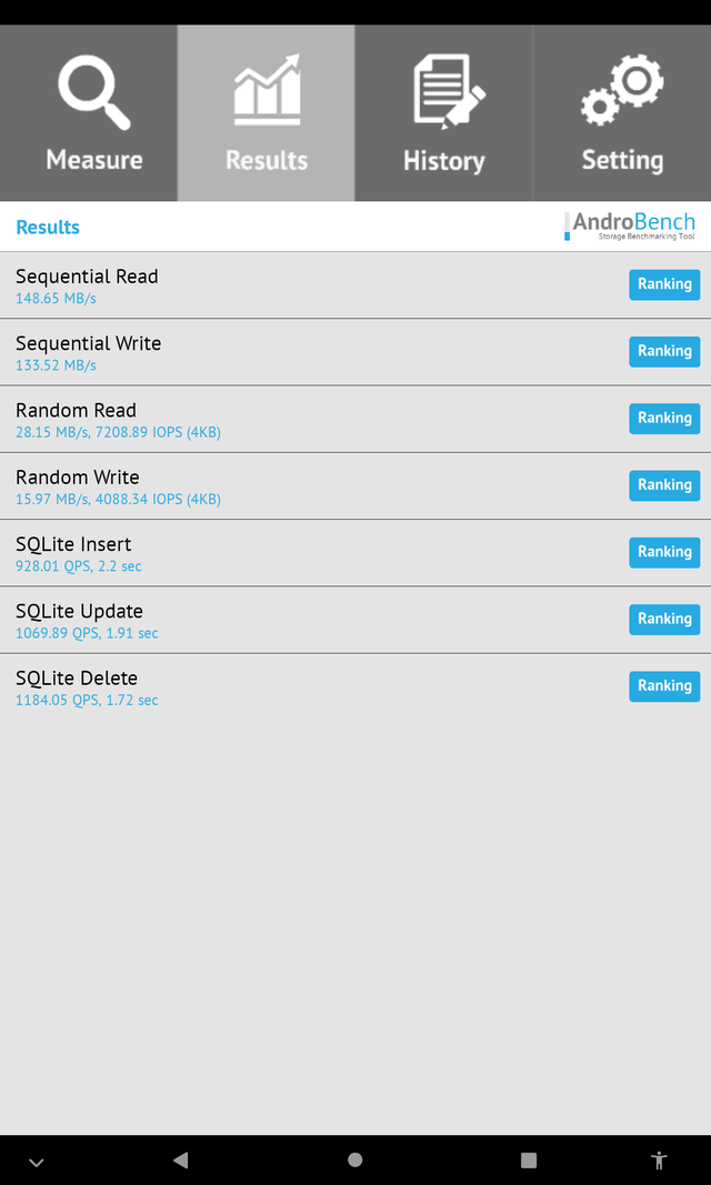 基于这款台电T40 Pro标配了8GB+128GB,使用Androbench测试内存的跑分,读写大约是148.65MB/S,在往平板拷贝文件的速度也算中规中矩。