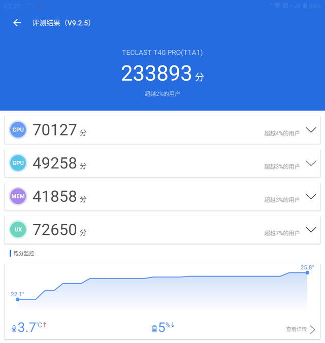 性能配置上,虽然台电旗下有多款平板都搭载了紫光展锐T618芯片,但细节配置以及系统优化依旧有很大不同。那么相比早期产品台电M40(21W跑分),台电T40 Pro在内置一颗八核处理器的情况下,究竟又能跑出多少分呢?通过安兔兔测试跑分的数据来看是233993分,比骁龙730处理器的跑分要高出不少。