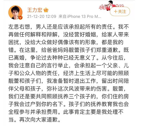 从王力宏的自诉中可以看出,他有被逼婚的成分:李靓蕾挺着肚子上门,父亲顾及家族名誉承认儿媳地位。