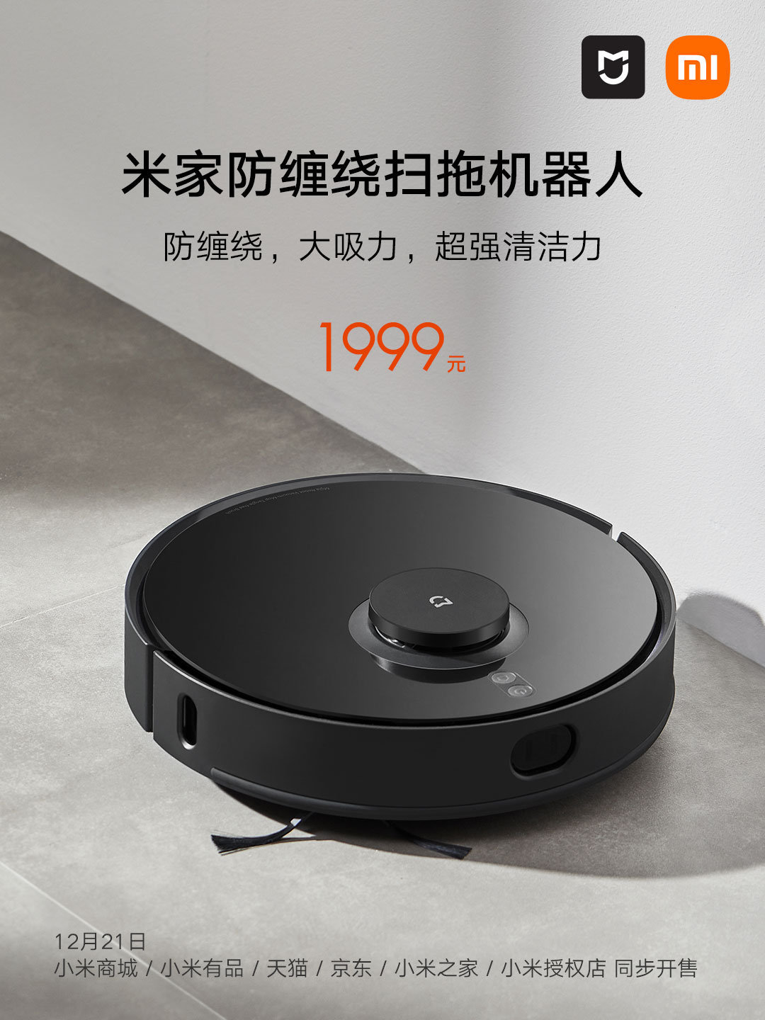 小米官方宣布,米家防缠绕扫拖机器人今日十点在各大平台正式开售,预价 1999 元,相对此前众筹价高出 100 元。