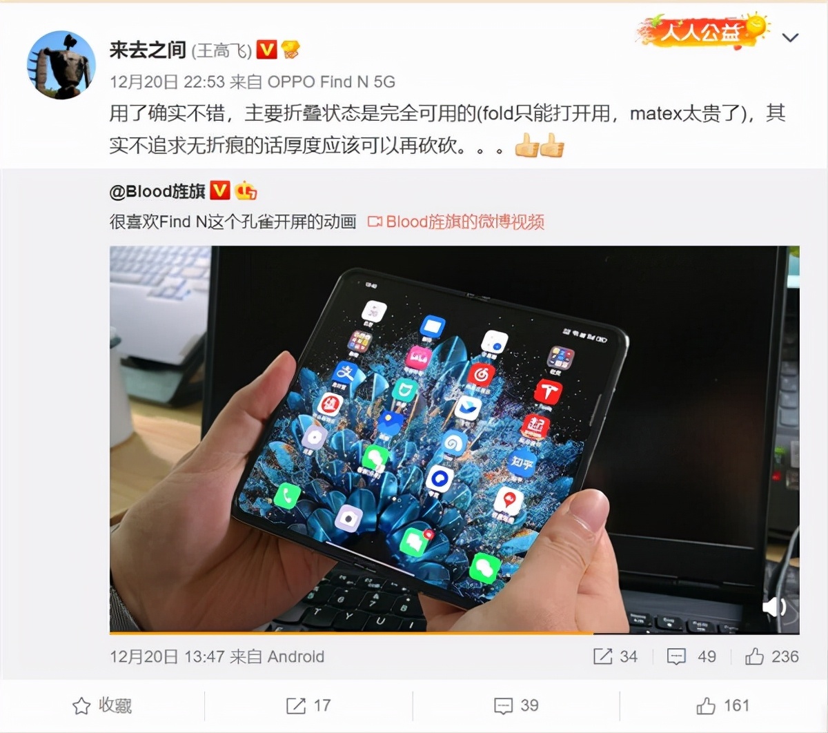 微博CEO王高飞评价OPPO Find N,表示“用了确实不错,折叠状态下也完全可用,三星Galaxy Z Fold3只能打开用,Mate X太贵”。