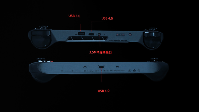 接口方面,机身顶部配置一个全功能USB-C 4.0接口,一个USB-A 3.0接口,一个3.5mm音频接口,机身底部一个全功能USB-C 4.0接口,可连接掌机桌面扩展坞OnexDocKing,支持多设备同时扩展,充电、上网、外接键盘、鼠标、显示器等一步到位。