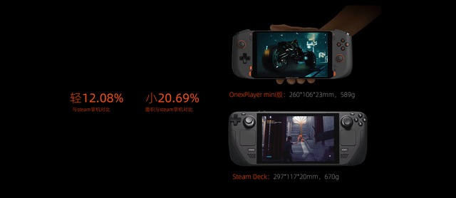 相比于今年5月发布的第一代OnexPlayer壹号掌机,OnexPlayer壹号掌机mini版拥有更小的体型,更轻的重量,采用7英寸屏幕,整机尺寸为260*106*23mm,重量589g,比Steam Deck掌机轻12.08%,小20.69%。