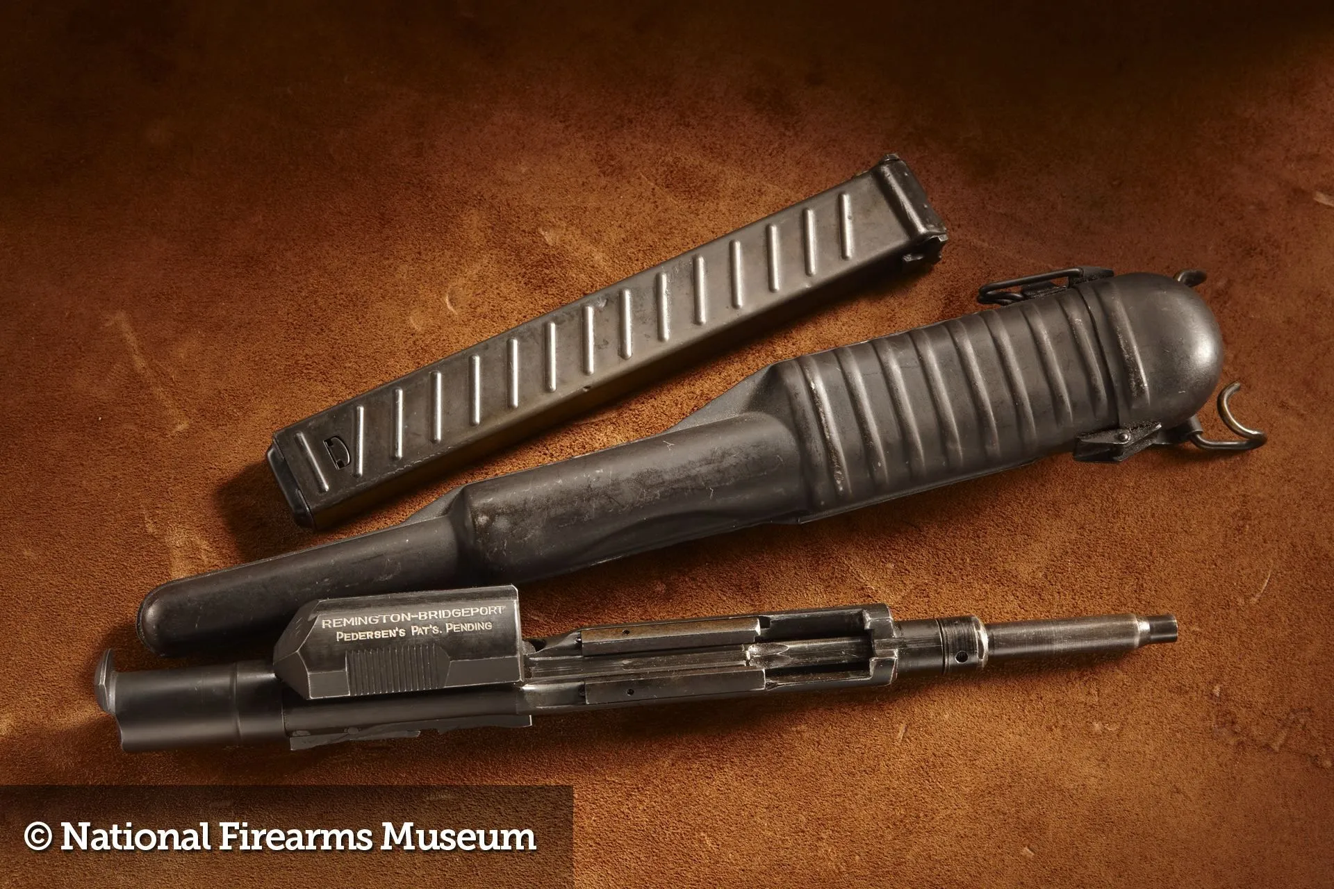 一个叫约翰·佩德森的美国设计师对着欧洲战场就开始琢磨,咱们手里这春田M1903射速太慢,要不给它改成半自动步枪吧。佩德森的想法是,在原有的春田M1903的基础上,加上一个转换套件,将这杆枪变成一个半自动步枪。这样的话,部队不需要召回原有的步枪,也不需要生产额外的枪械,只要生产足够的转换套件,直接运到欧洲,发到士兵手里就OK了,也不需要把士兵手里的枪再收回来,省了很多事。