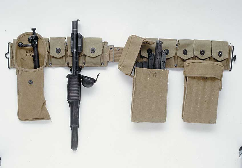 美军专门为佩德森装置设计了一套携行具,就是下面这个东西。上面是10个.30-06的弹药包,外加两个佩德森装置的弹匣包,和一个M1903的枪机的专用包。不仅如此,美军还给佩德森装置设计了一个宏伟的蓝图,当时协约国制定了1919年的春季攻势,为了这个战斗,美军计划采购13万套佩德森装置和8亿发子弹。