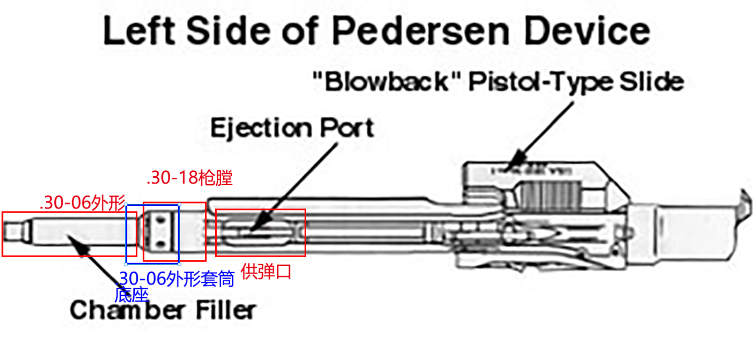 昨儿聊了聊95能不能打M16的5.56*45mmNATO,聊这个问题的时候说了,子弹发射前枪膛内壁和子弹要做到严丝合缝,才可以发射。那么这个佩德森装置既然用的.30-18手枪弹,它就必须得有自己独立的枪膛,不可能直接装在原来春田M1903的枪膛里。而设计了独立的枪膛,你又要跟原来春田M1903的枪膛完成衔接。于是乎,在佩德森装置的枪膛前端,就又有一个.30-06外形的小套筒,这个套筒的底座拧在佩德森装置的枪膛上面,而这个套筒就相当于是一小截枪管。就是这个小套筒,伸入春田M1903的弹膛,去和枪膛内壁贴合,完成衔接。