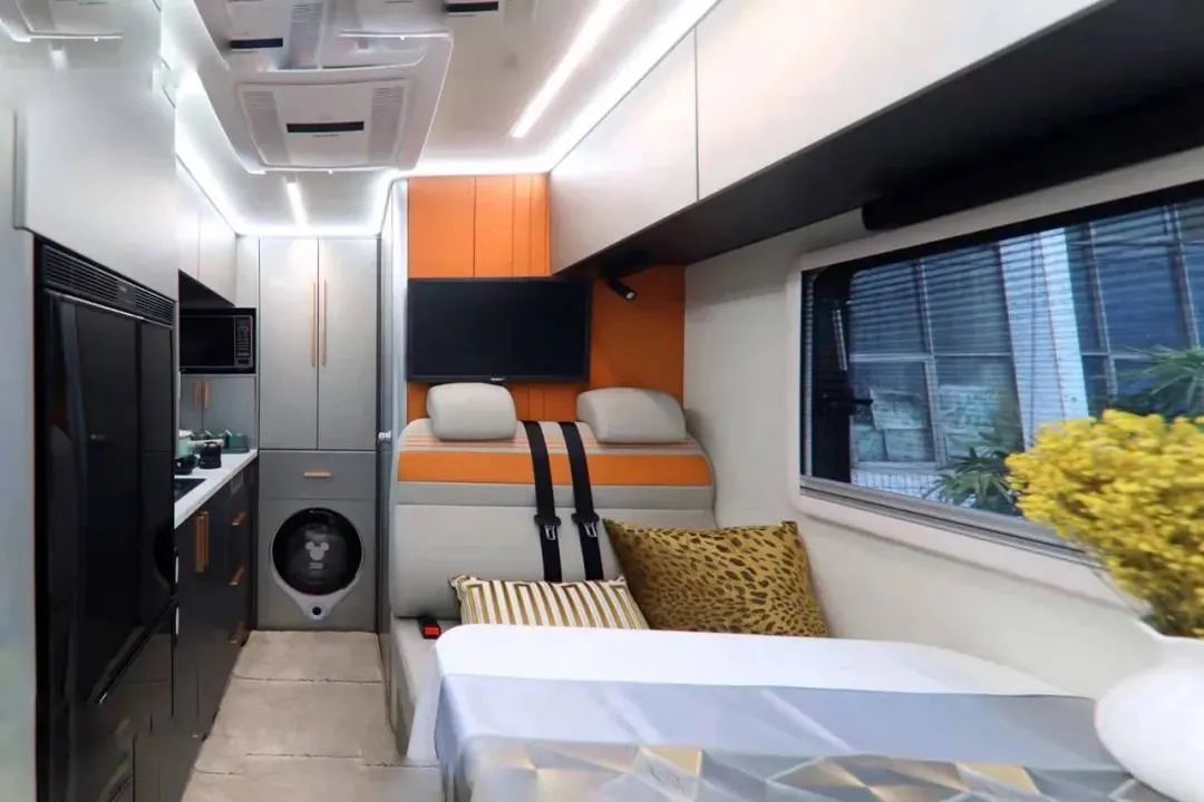 生活区尾部为厨房区与独立封闭式卫浴区,配备功能齐全的厨卫设施,丰富的储存空间也能满足日常储物需求;下方设有嵌入式洗衣机可为旅居生活解放双手,轻松清洗衣物。