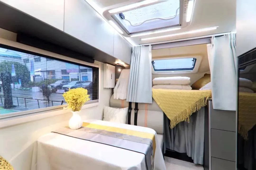 车内多处反弹器、开门合页等五金件均采用进口确保日常使用的稳定性与可靠性;生活区配备瑞典多美达房车专用直流变频顶置空调、德国埃贝赫驻车加热器和暖风系统、天窗等,并在房车生活方面设有全方位智能互联系统,智能科技支持大屏触摸、语音、APP三位一体式操控,可远程控制车辆开关空调、解锁驾驶及中门,监控水、电、油量、续航里程、胎压,实现寻车和四眼安全监控全车功能;智能健康管理能实现新风、二氧化碳监控;而灯光智能系统可控制车内氛围灯、卫浴灯、迎宾灯,实现一键式睡眠。