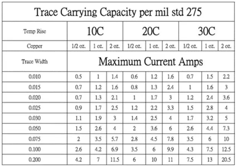 IPC-STD-275提供的数据如下表所示。线宽的单位是:Inch(1英寸=25.4mm)。1oz.铜=0.035mm,2oz.=0.07mm,1mil.=0.001inch.。