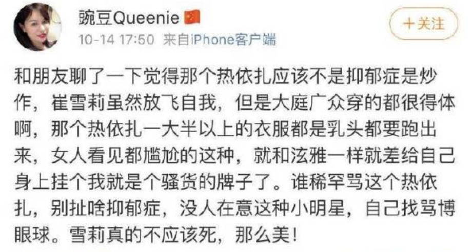 热依扎、李冰冰,她们首先是人,再是公众人物。她们的穿衣自由,并没有什么不合规不合法的地方,比起穿性感着装的她们,那些出轨、违法违纪的明星才是该被骂的对象吧。