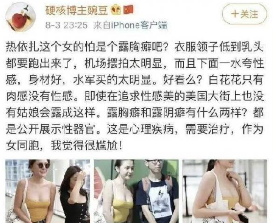 其实从源头来看,热依扎才是被伤害的那一方,只因在工作之外的机场穿了回低领吊带,就被人用恶劣的词汇侮辱,搁谁身上受的了?