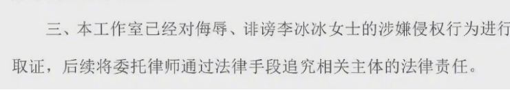 李冰冰也在半夜发出声明,表示自己作为公众人物会传达正面影响,并将追究恶意举报、诽谤的那个儿科医生的法律责任。