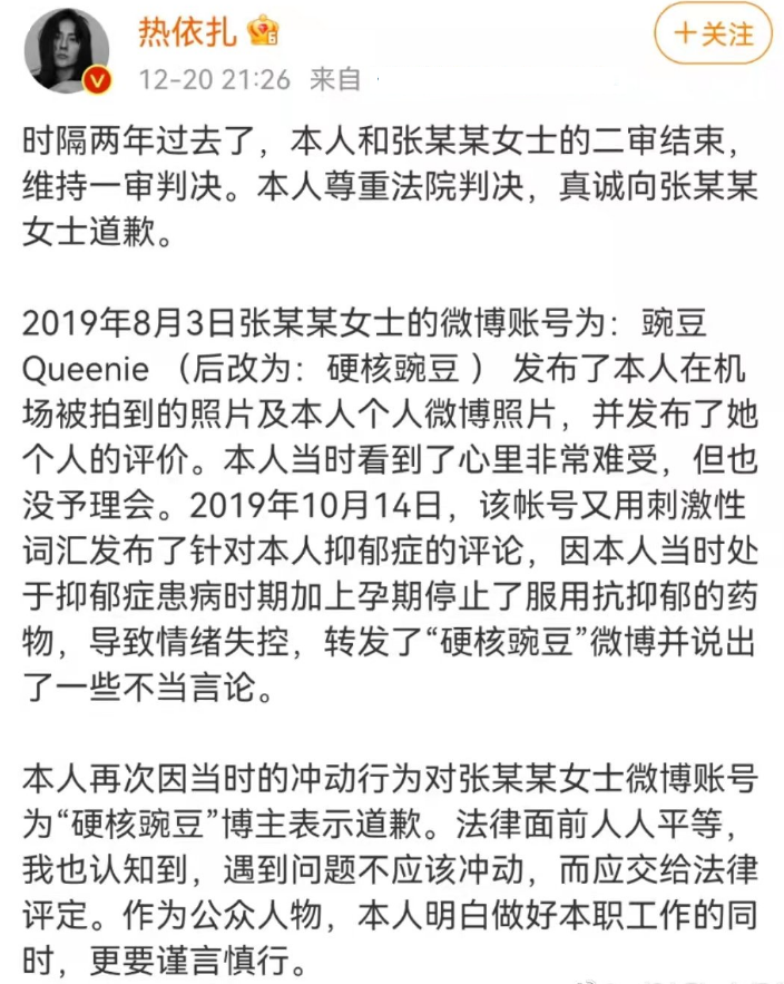 如今两年过去,法院判决两方都有错,分别向对方道歉。热依扎的歉意书发了出来,但那位侮辱她身材、品行的网友,却迟迟不做声。