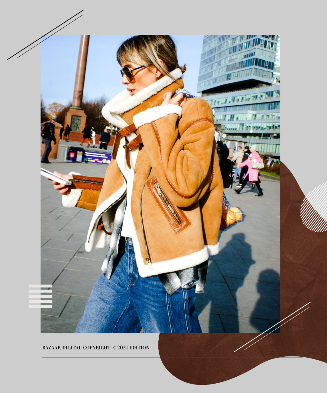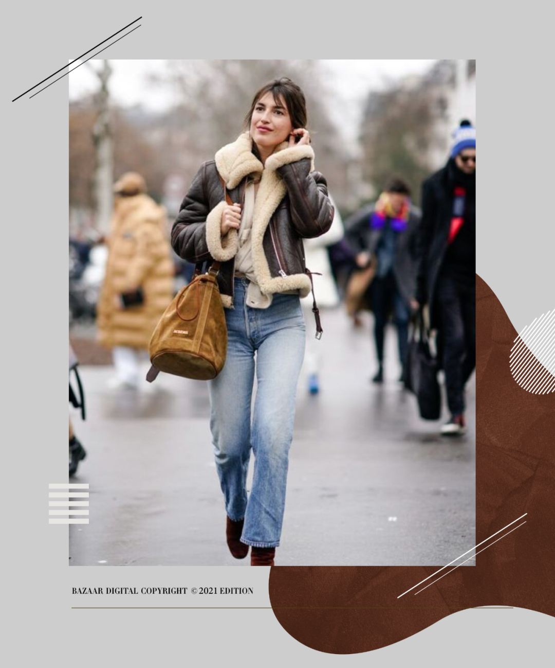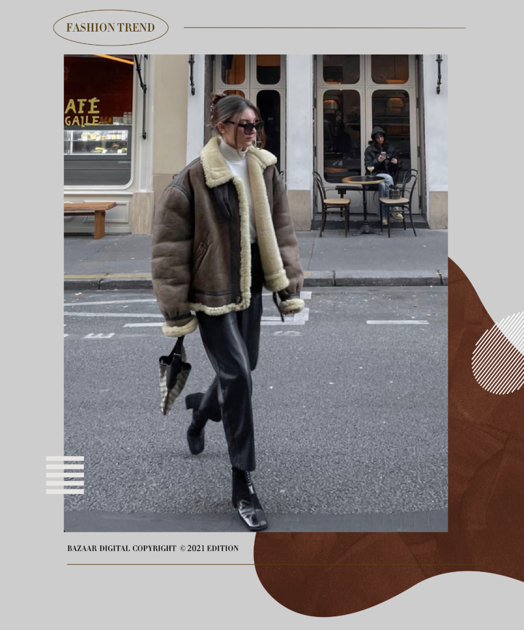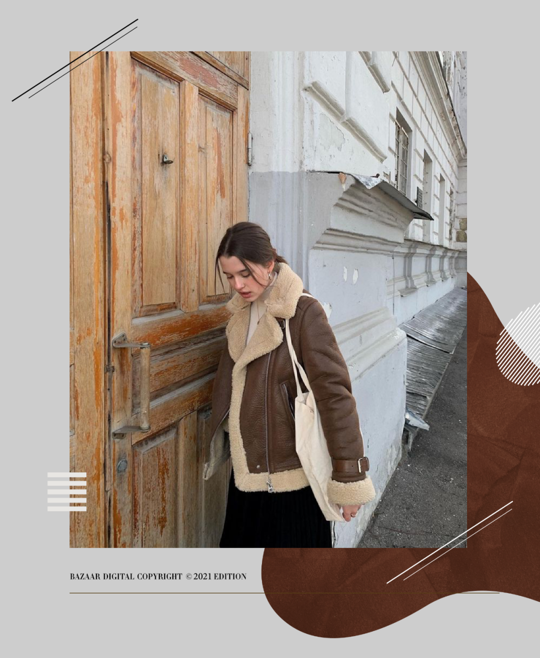 当然,在皮毛一体的海洋里馥郁饱满的巧克力棕也是不错之选。不对称翻领能让夹克更有设计感,搭配手拎的羊羔毛包包,可爱轻巧的同时,也避免上身过分局促。
