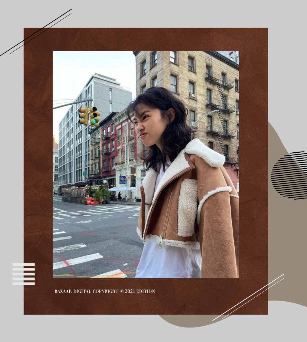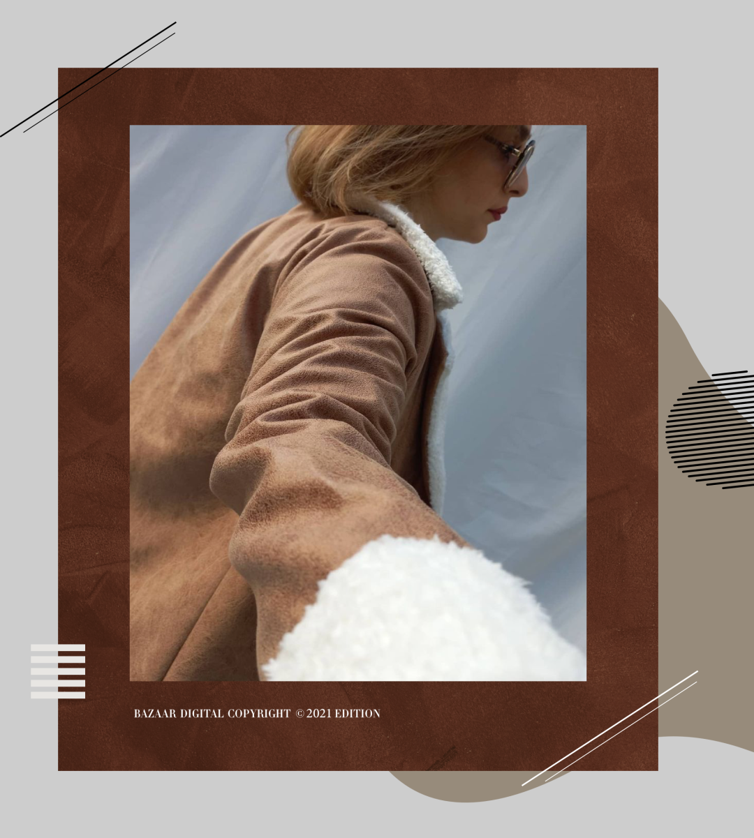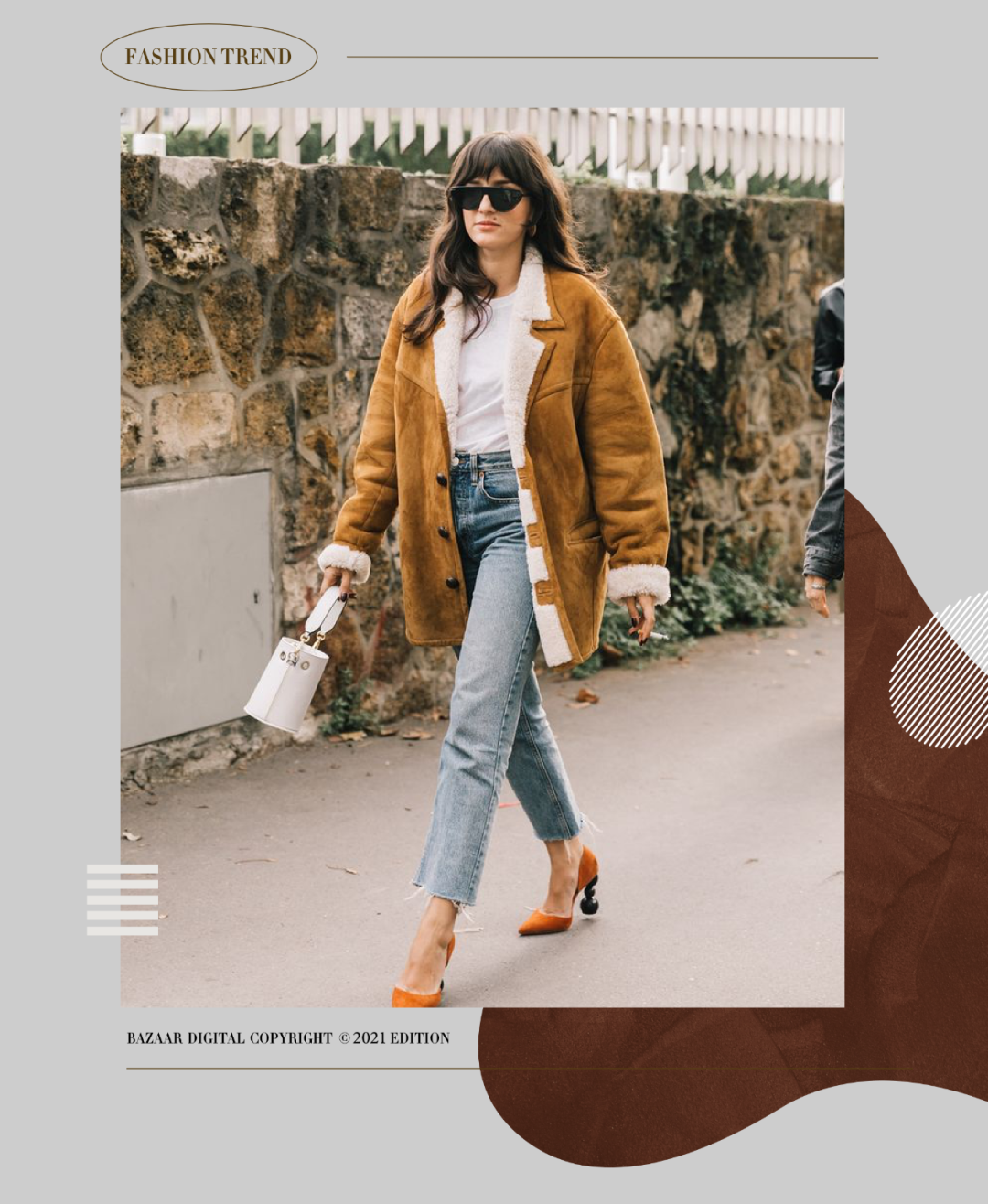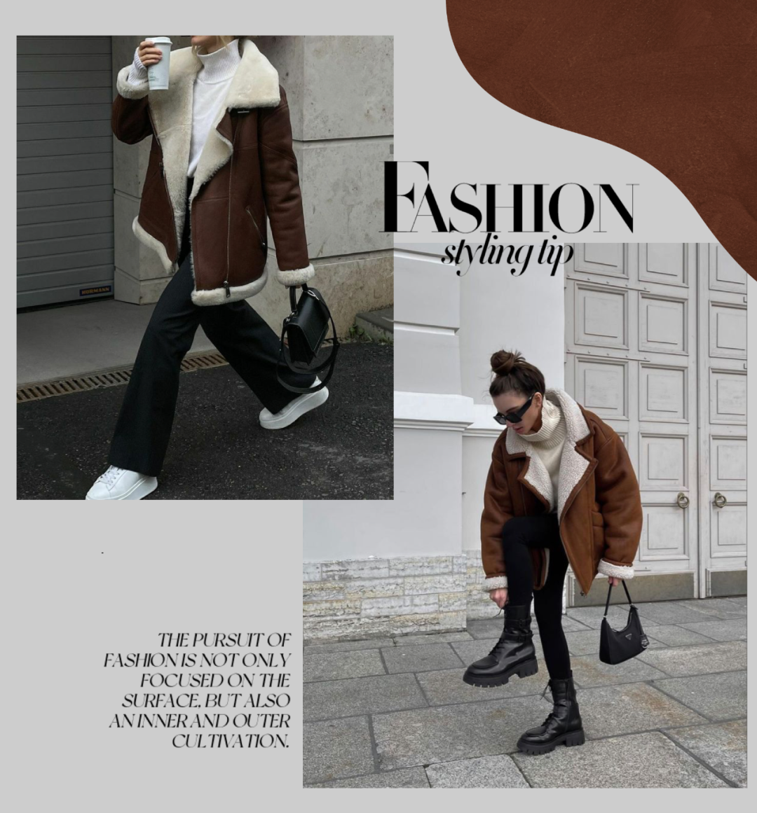 当然,在皮毛一体的海洋里馥郁饱满的巧克力棕也是不错之选。不对称翻领能让夹克更有设计感,搭配手拎的羊羔毛包包,可爱轻巧的同时,也避免上身过分局促。