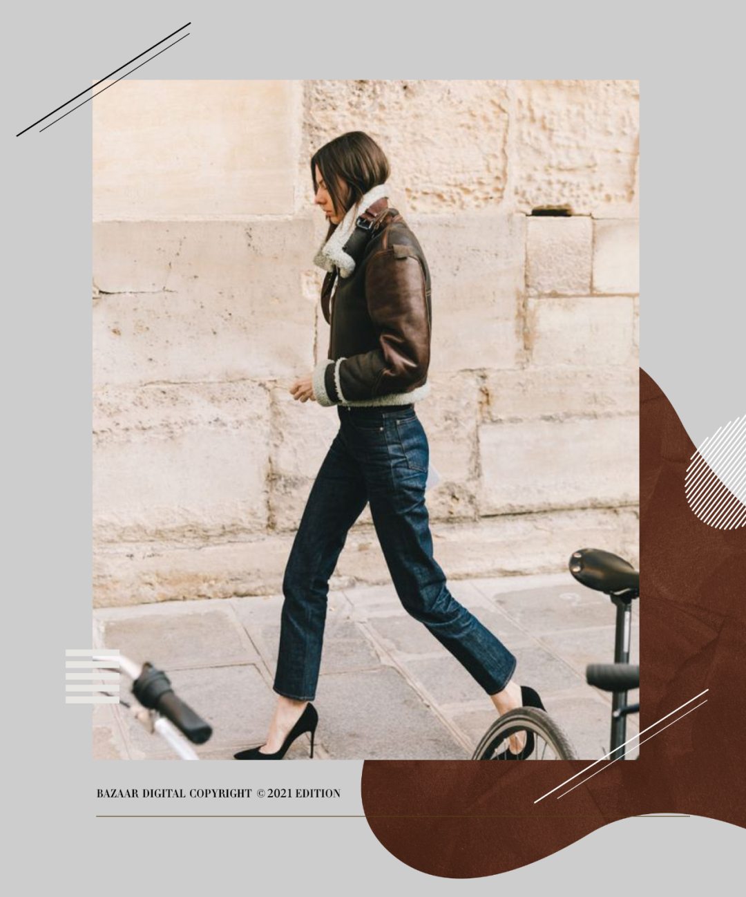 恰好及腰的短款中和了棕色皮夹克略显粗犷的气质,整体看着也会精练利落许多。