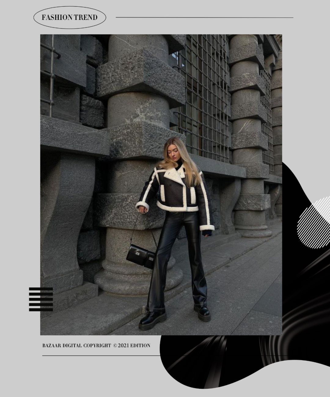 担心黑色稍显沉重会“吃掉”身高的小个子女生,不妨大胆尝试短款设计。白色翻边明确了腰线,也让上半身更有分量感;搭配高腰亮面皮质阔腿裤和厚底鞋,相信能让你的腿一整个长到出框。