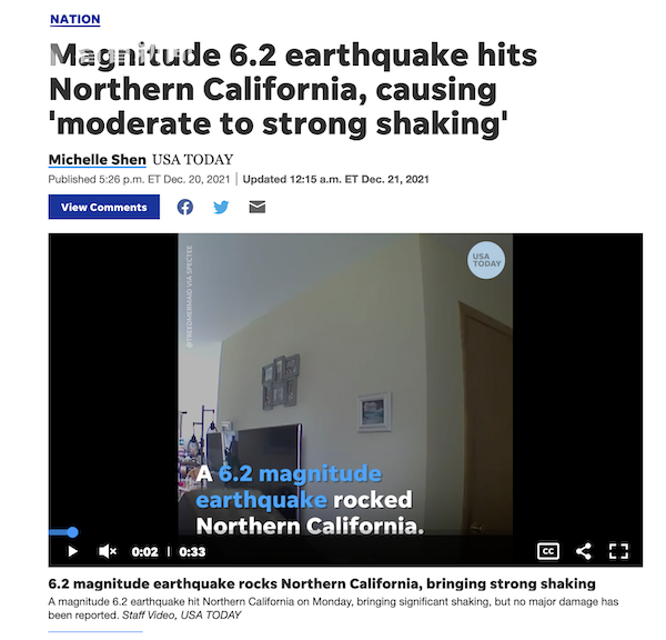 美国媒体当地时间12月20日报道称,加利福尼亚州北部海岸当日下午发生6.2级地震,多地报告财产损失。
