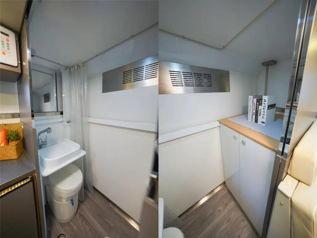 房车的尾部设置了独立卫生间,采用整体式设计,内部配有换气扇、照明灯、储物置物架、淋浴花洒(冷热水)、折叠一体式面盆、盒式马桶、梳妆镜等,满足卫浴、洗漱需求;卫浴区还配有5000W进口燃油加热器,洗浴时打开可输送暖风。