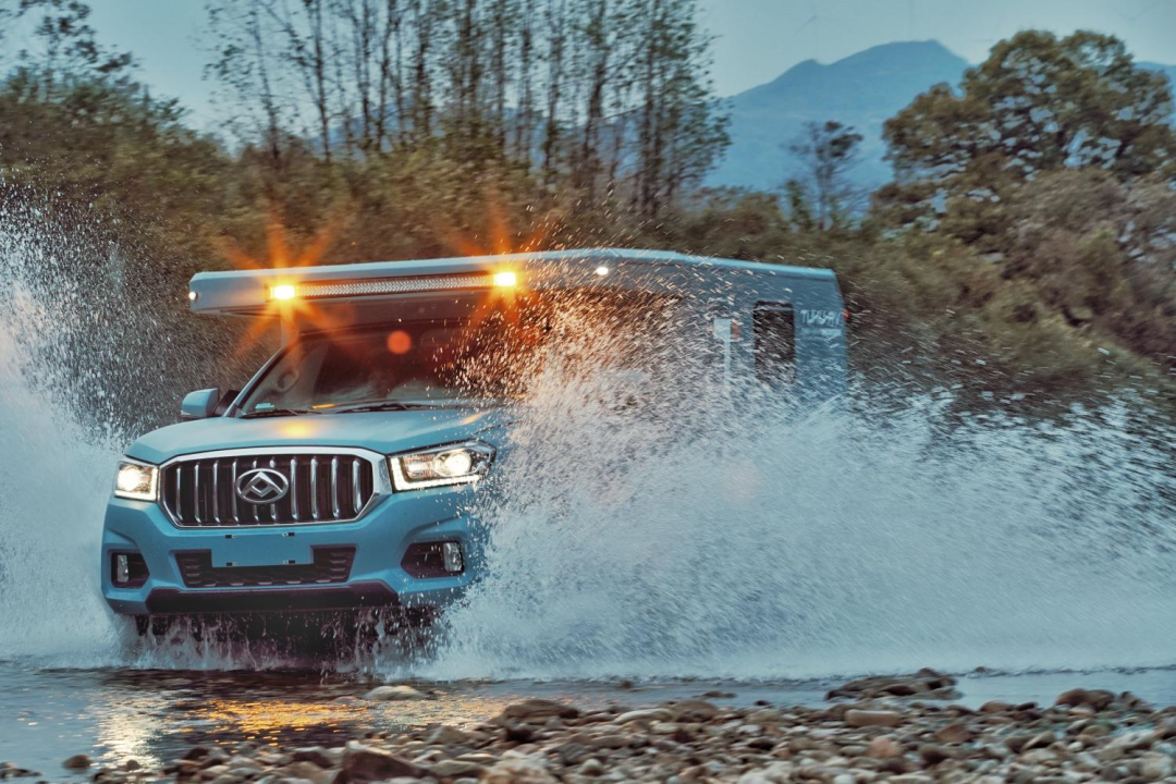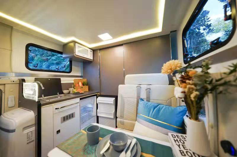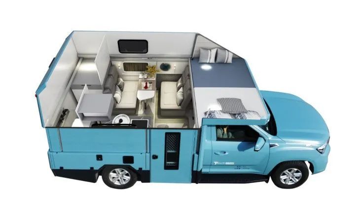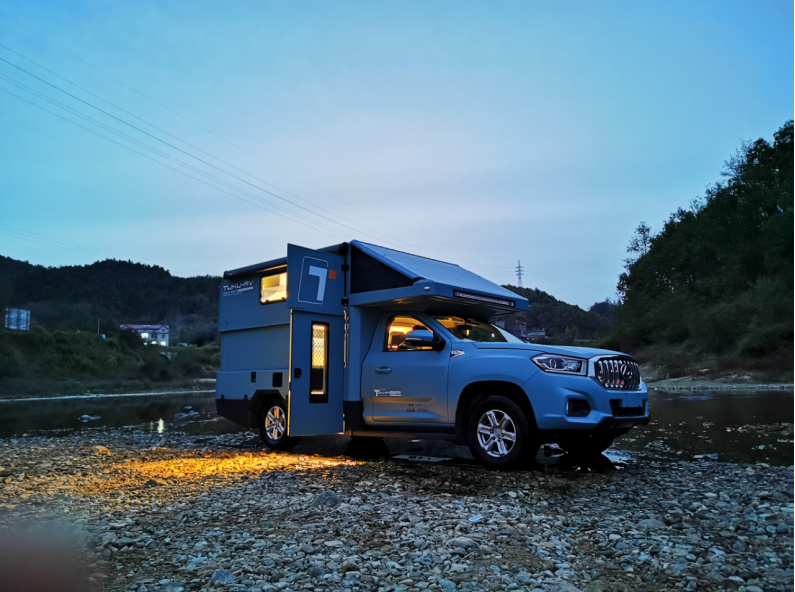 这款房车的豪华版采用上汽大通T70皮卡底盘,动力方面搭载2.0T柴油发动机,传动系统匹配6AT变速箱,最大功率120kw,后期还将推出其它底盘的版本;悬架形式采用前双叉悬臂螺旋独立悬架+后全渐变式钢板弹簧非独立悬架,保证车身稳定性,让行车更加平稳;前置四驱的驱动系统,保证车辆在野外山坡、滩涂、泥地也能稳定行驶;刹车系统采用四轮盘刹,制动稳定性好,反应灵敏,同时散热性、抗热衰退性也很强。