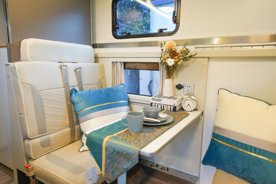会客区位于驾驶室后方,设有加长对坐式卡座,可满足多人乘坐休息;卡座设有安全带,保证行车乘坐时的安全;对向卡座可拼成有一张850x2000mm单人床,满足睡眠需求;卡座中间设有可拆卸挂桌,供日常聊天、就餐使用;卡座侧面设有大尺寸推拉窗,保证车内通风采光。