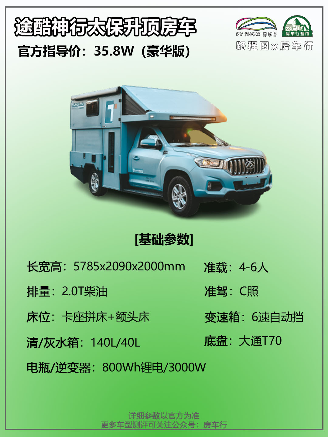 前段时间,小编给大家透露了途酷神行太保房车的一些信息,这款房车外观清新靓丽,并且同时具有B型、C型房车的使用功能,非常引人注目。现在这款房车已经上市了,小编第一时间拿到了这款房车豪华版的参数信息,今天就来给大家详细介绍一下这款房车。