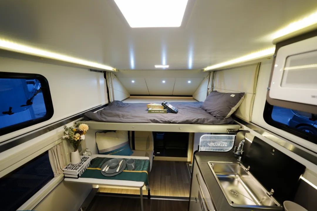 额头休息区位于驾驶室上方,打开顶部升顶结构后就可使用;床的侧面设有铝合金导轨,拓展后可增加睡眠面积,最大尺寸可以达到1880x2000mm,可以轻松睡下两个成年人;床顶设有床顶灯,满足夜间照明需要;床的下方设有乘客舱照明灯饰及氛围灯系统控制面板,可实时调控车内照明系统。