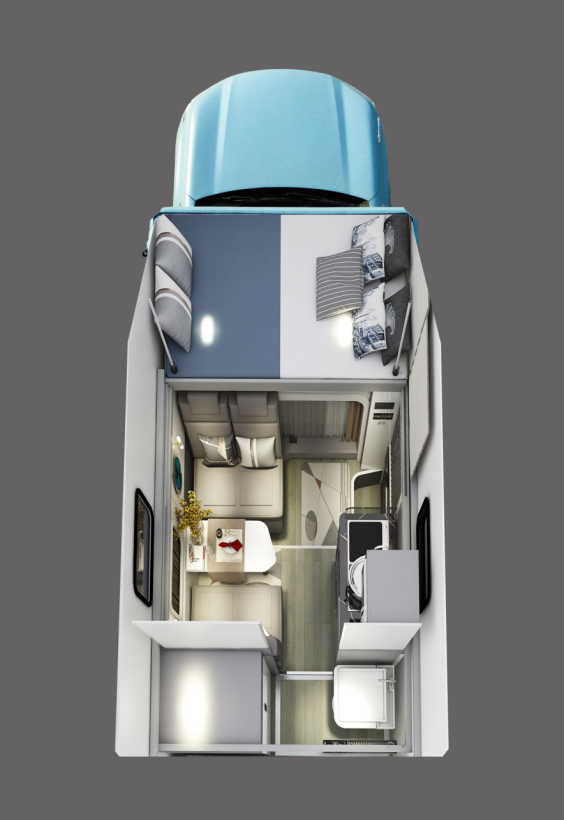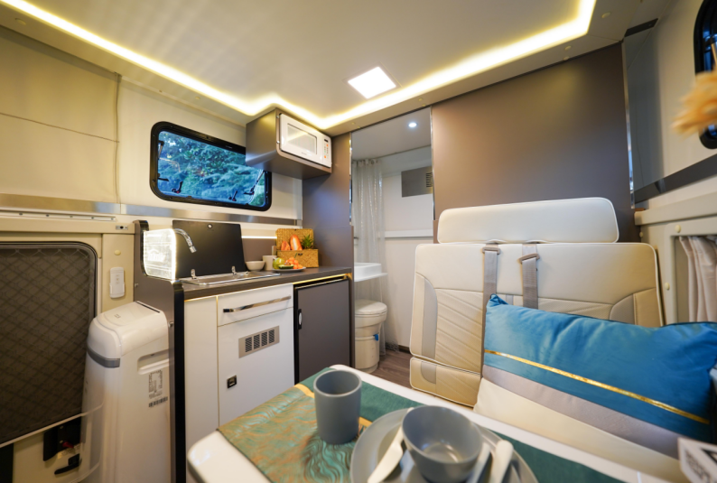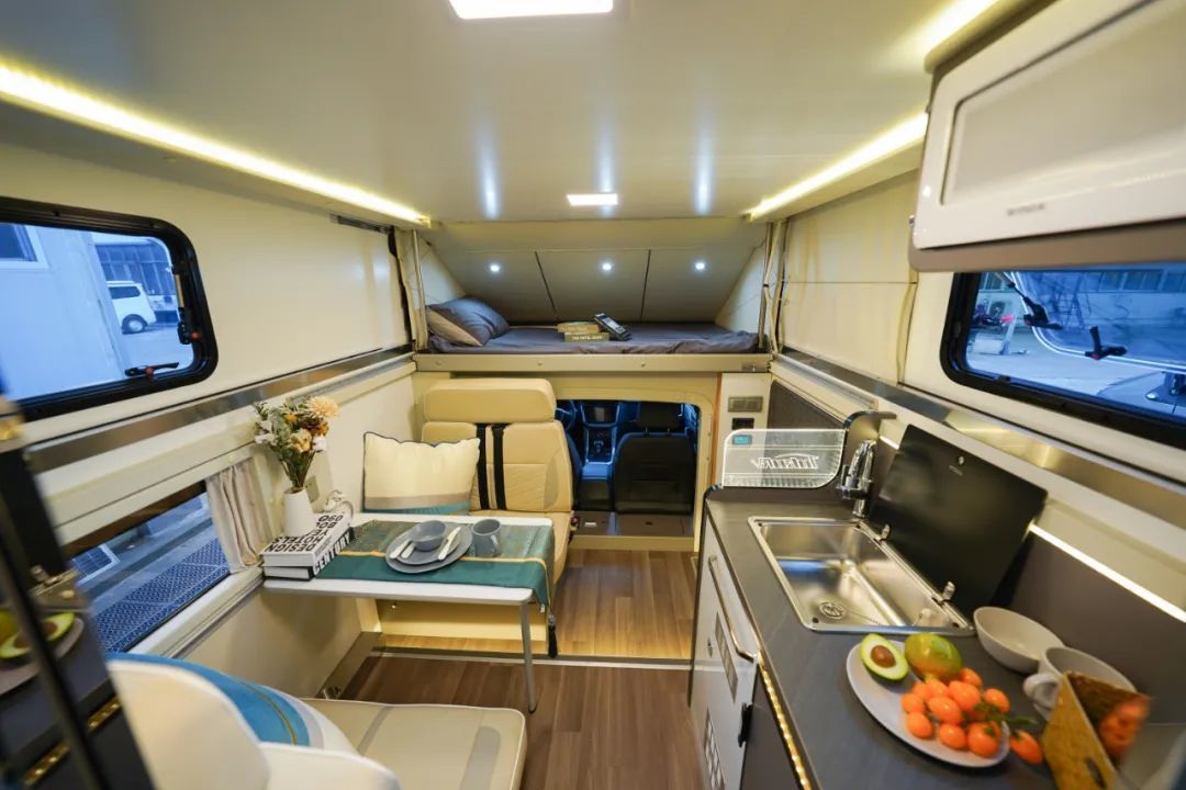 新车的车身外侧配备了齐全的生活设施,包括主副驾全铝踏步、置物板、市电接口、重力注水口、220V市电充电专用电源线(10m)、220V市电充电专用插座、户外照明灯等设施;偏爱户外遮阳棚的车友,还可根据个人需求选装手动遮阳棚;房车顶部设有硬质升顶的结构,行车时关闭,可以得到比B型房车更好的通过性,驻车后打开升顶结构,拥有C型房车宽敞的内部空间。
