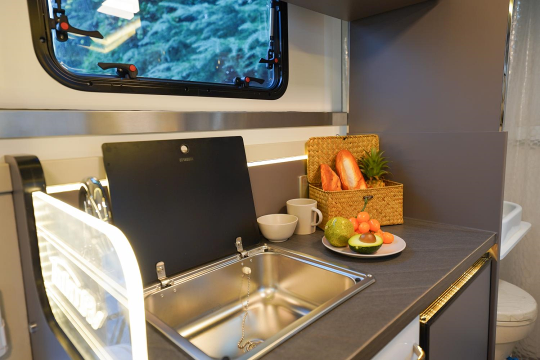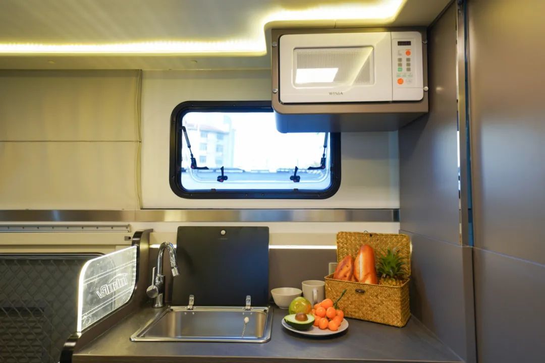 会客区对侧是厨房区,采用一体式橱柜设计,配有洗菜池、独立水龙头、88L冰箱(12V)等设施,轻松解决日常烹饪任务;橱柜左侧设有壁龛式空调,用于调节车内温度;洗菜池上方设有推拉窗,烹饪时打开可以散去车内的油烟味。