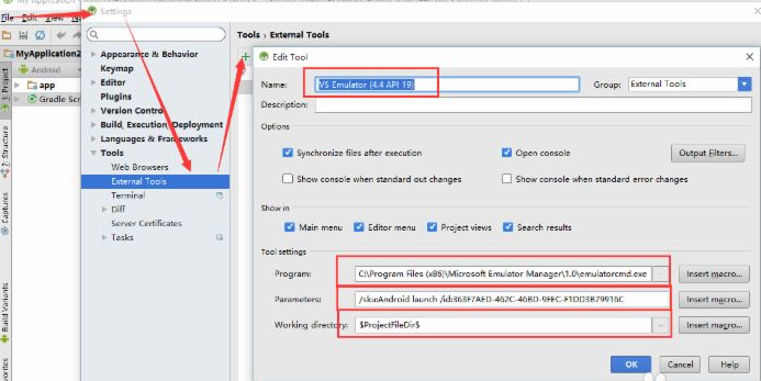 Program:填写Visual Studio Emulator for Android安装目录下的emulatoecmd.exe的绝对路径,就是用它来启动模拟器的。笔者的是 C:\Program Files (x86)\Microsoft Emulator Manager\1.0\emulatorcmd.exe 。