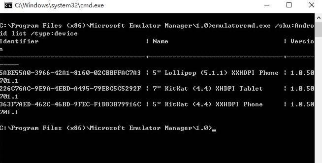 Parameters:添加启动模拟器的参数,/sku:Android是说明打开Android的模拟器,/id:后面的Guid是模拟器的唯一 编号, 总的意思是指定要启动哪一个Android模拟器。 id可以通过 emulatorcmd.exe /sku:Android list /type:device 获得。如下: