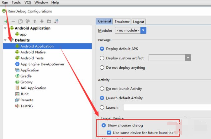4、打开模拟器,依次选择Android Studio> Run > Edit Configurations > Defaults / Android Application /General 选项卡的 Target Device 节点,勾选 Show chooser dialog 和 Use same device for future launches 。 记得不要忘记点Apply和OK。