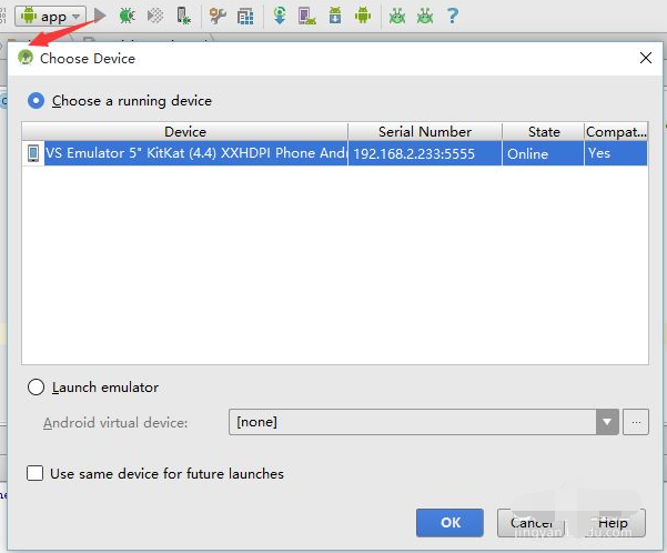 11、用Visual Studio Emulator for Android调试Android App:按下 Run 按钮,弹出选择Android设备的选择框。