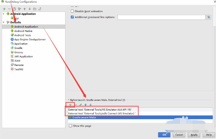 13、进一步完善缩短操作的话,可以参照以下:打开 Run > Edit Configurations > Defaults / Android Application / Emulator 选项卡的BeforeLaunch 节点,把我们刚才创建的两个 External Tool 添加到此处 , 记得不要忘记点Apply和OK就可以,这样就不用每次调试前都要点一下启动模拟器的按钮进行调试等。