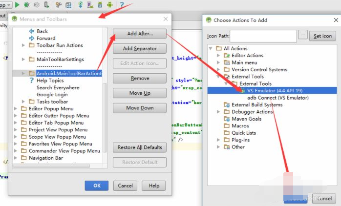 接着在toolbar空白处点击右键,选择 Customize Menus and Toolbars 。然后导航到Main Toolbar > Add After >在弹出的面板中找到 External tool > VS Emulator (4.4 API 19) 然后按 OK 。