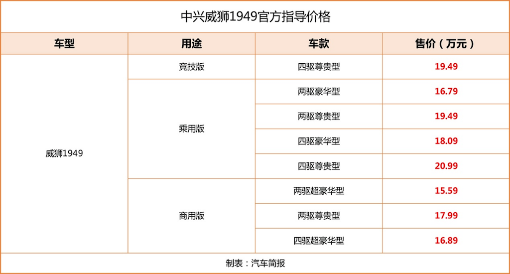 威狮1949此次同推出3款车型,售价从15.59万~20.99万,从12月22日开始接受订单,预计3月起批量交付。用户购买威狮1949即可尊享“五重”大礼:试驾礼——用户进店试驾,即可获得精美礼品一份;4949现金礼——在12.22-12.31日期间,前1949名订车用户可享交49元抵4949元购车礼遇; 置换礼——中兴汽车任意车型的老车主置换威狮1949,全部享受5000元的置换补贴;金融礼——购买威狮1949的新老客户可享受2年免息,3年低息,定额贷政策;VIP服务礼——首批车主可以享受发动机及底盘核心零部件终身质保服务,前1000名用户还将享受上门服务、厂家的多对一专享服务,赠送全车贴膜等福利。凭借出众的产品力和亲民的价格,相信威狮1949会为大家带来全新的皮卡出行体验。