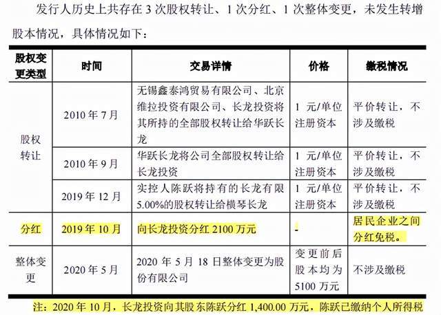 2019年10月,北方长龙曾在向股东长龙投资分红2100万元,以及在2020年10月向股东陈跃分红1400万元。前文已经提及,陈跃持有长龙投资99%的股权。