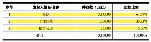 据招股书披露,目前北方长龙的股东主要有3名,分别为陈跃、长龙投资和横琴长龙,持股比例分为为61.67%、33.33%和5.00%。