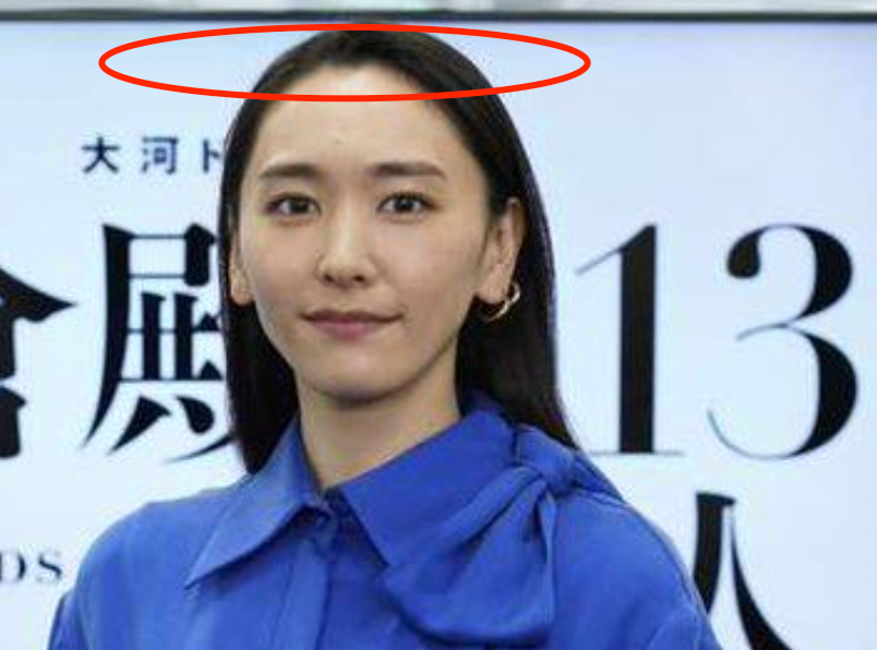 只是新垣结衣的额头上没了以前的少女空气刘海,发际线也十分引人注目,高的有些明显,额头上的痣也显现了出来。