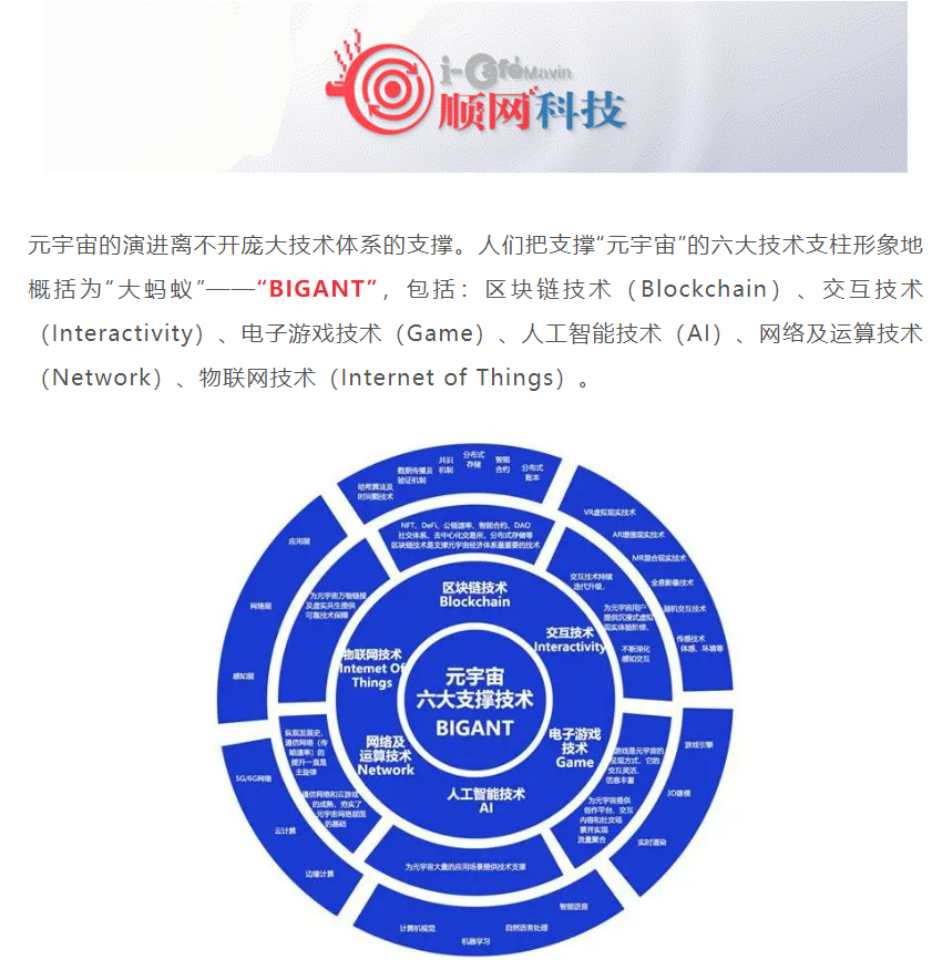速途元宇宙研究院12月22日消息 今日,顺网科技官微推文称,目前,在元宇宙的6大支撑技术BIGANT体系中,顺网主要着重于N,即网络及运算技术。