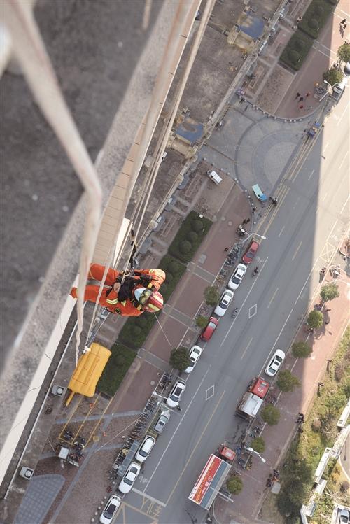 接警后,消防救援人员立刻赶往现场,远远地就能看到万达广场外墙上挂着的人影。救援人员到场后,兵分两路,一组人员迅速铺展开救生气垫并做好警戒维持现场秩序,另一组由绳索专业队人员组成营救小队,携带救援装备登上顶楼开展救援。