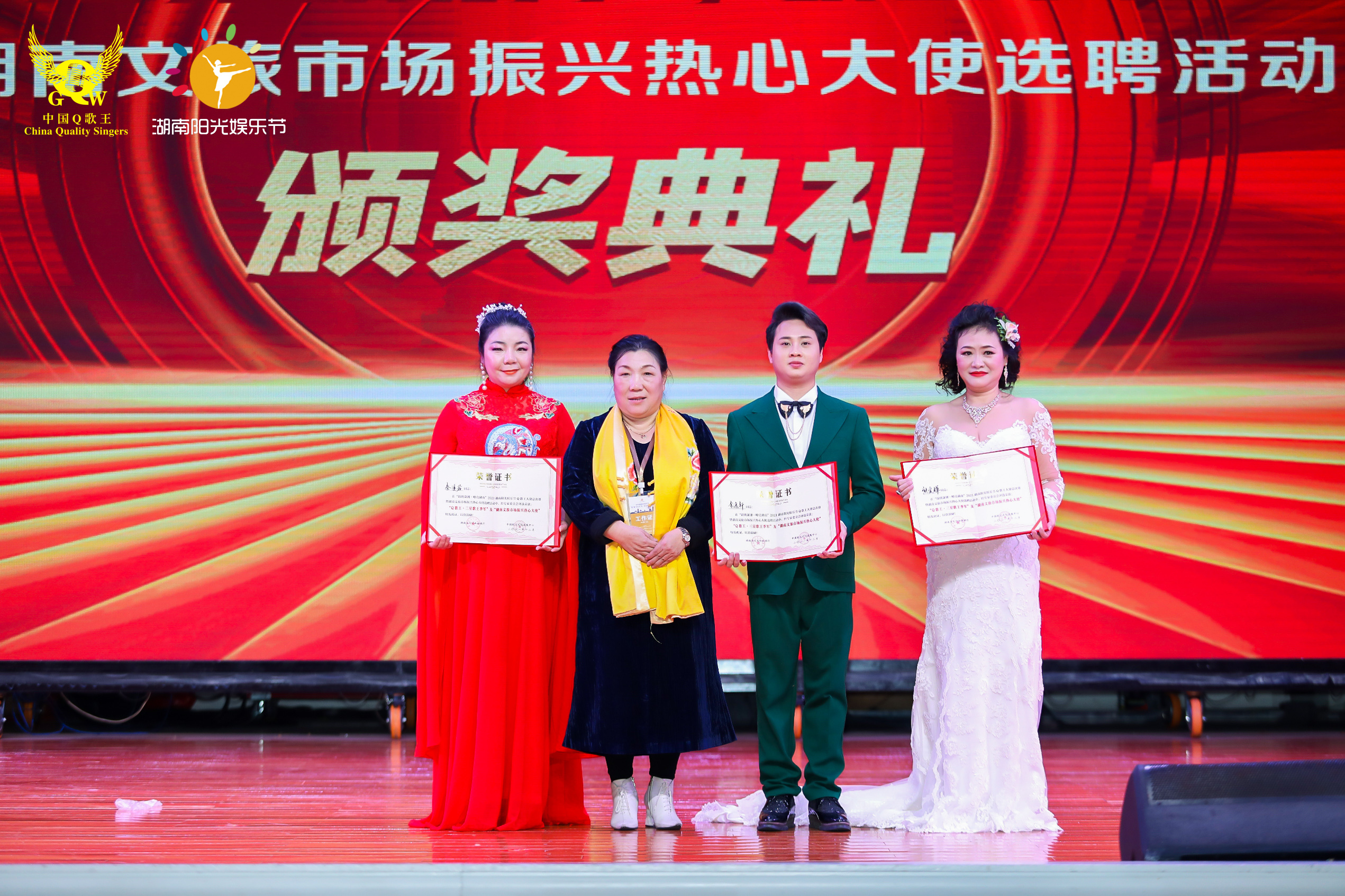 荣获湖南文旅市场振兴热心大使:曹硕、周婷雪、谭新立、张楚书,由湖南省文化和旅游厅市场管理处二级调研员夏雄英、中国Q歌王创始人邓一中颁发荣誉证书。