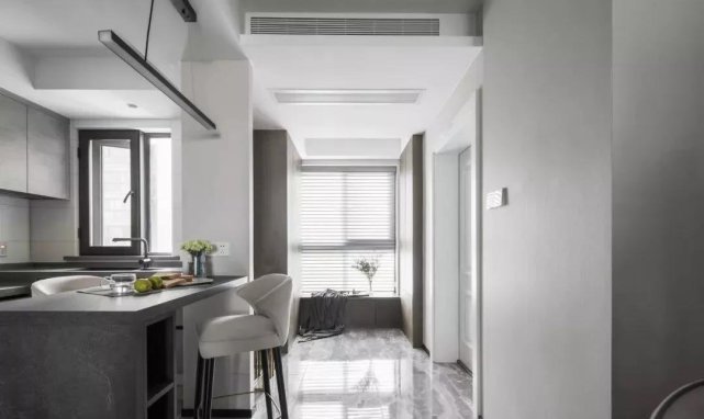 入户映入眼帘的是非常大气的开放式厨房,西式中岛台隔断放上高脚椅也是吧台。旁边百叶窗下做了一个小飘窗,打造成简单休闲区。