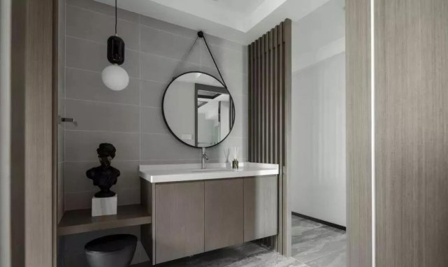 洗漱台单独分离于卫生间,灰咖色调简约高级。