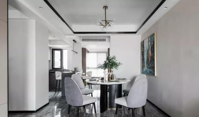 餐厅大理石质感的圆形餐桌周边摆放非常有质感的现代风格靠垫餐椅,墙面挂上一幅浓墨重彩的油画,为整个灰白空间增添鲜活。