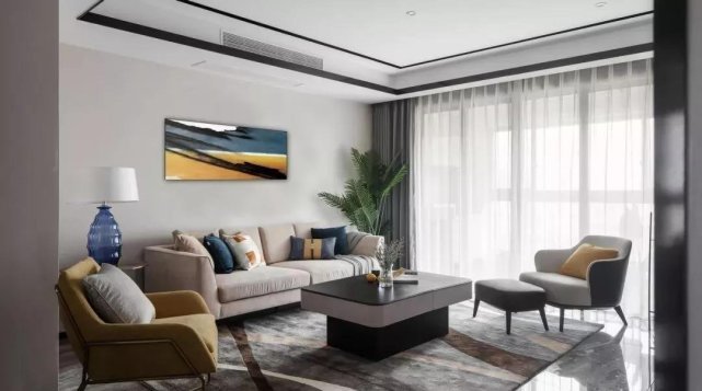 客厅利用黑框设计感和简约的地台板,打造出颇具后现代艺术感的电视背景墙。吊顶的黑边设计,也贴合整体风格,非常简约时尚。